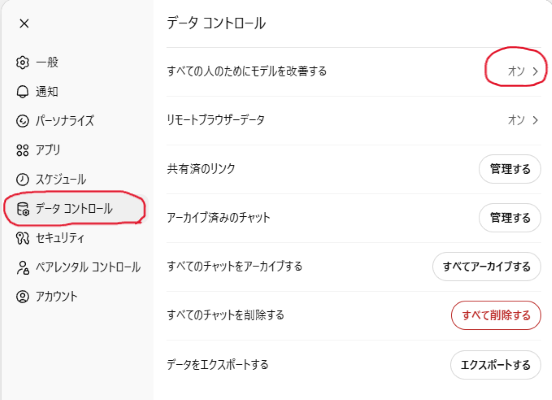 初期状態では「学習する」設定になっているため、ChatGPTを安全に利用するために、最初に行いましょう。