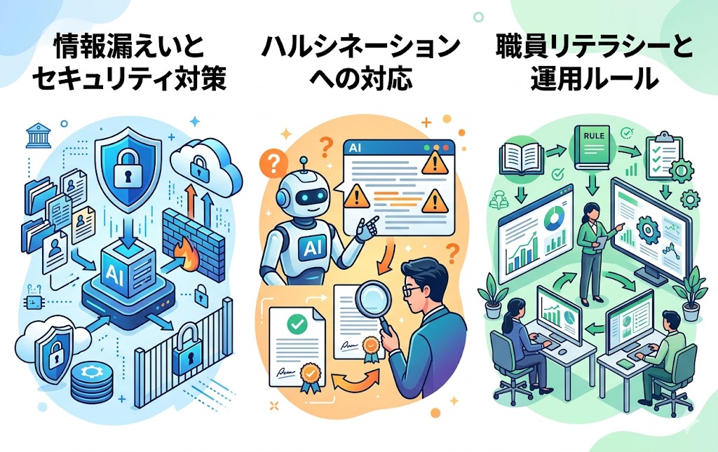 AIの回答をそのまま利用するのではなく、必ず職員が内容を確認し、公式情報と照合する運用が必要です。