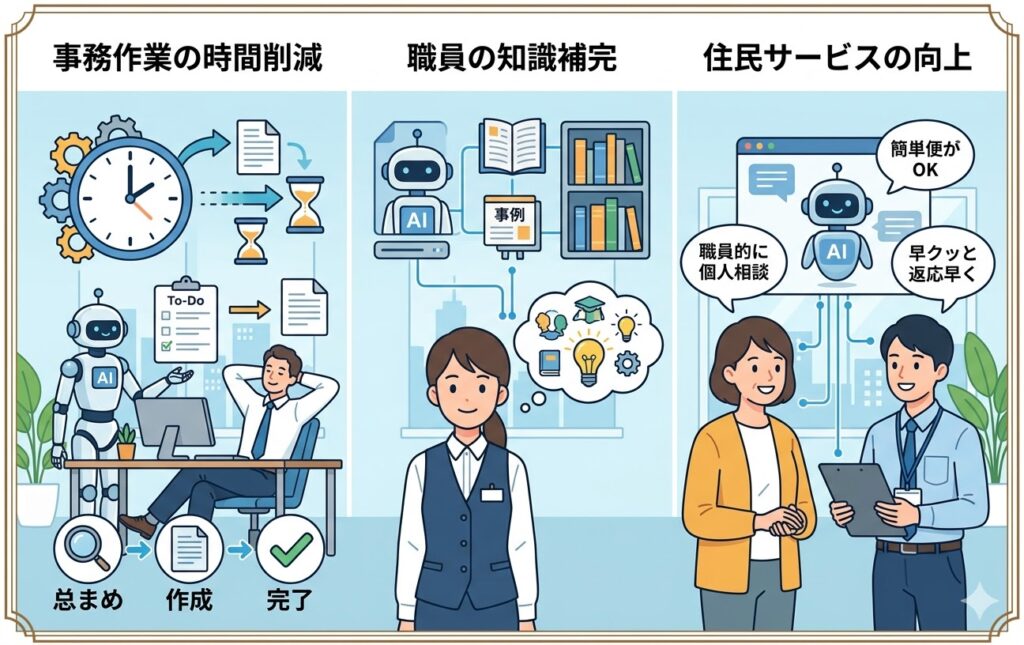 AIを活用することで、職員は政策立案や住民対応といった重要な業務により多くの時間を割けるようになるでしょう。