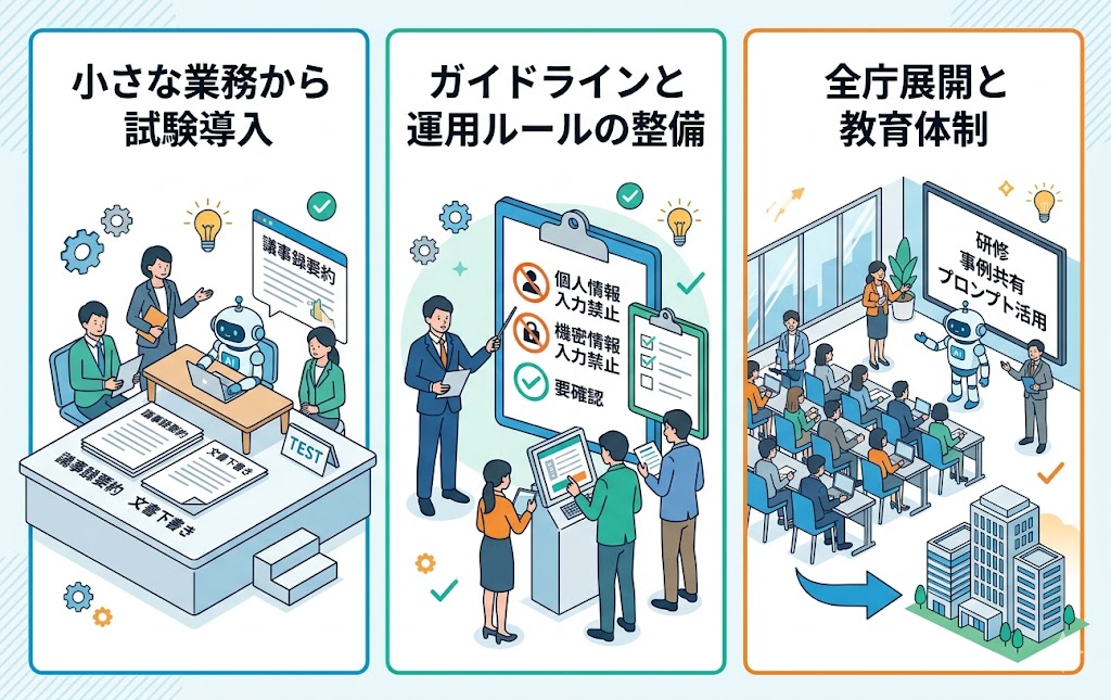 実際に成果を出している自治体は、試験導入、ガイドライン整備、職員研修を段階的に進めながら活用を定着させています。