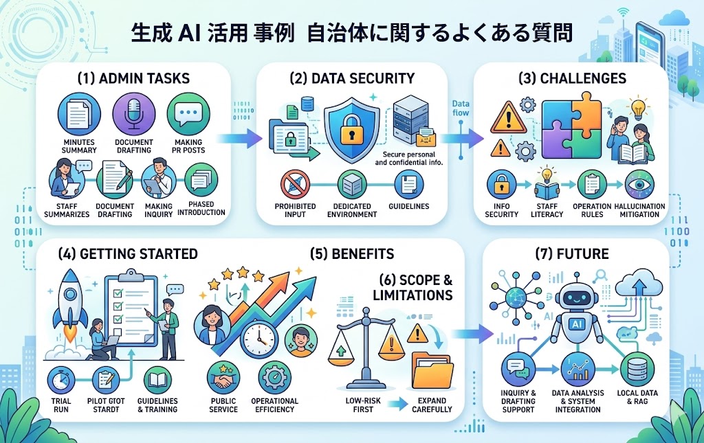 議事録の要約や文書作成支援、問い合わせ対応など、比較的リスクの低い業務から活用が始まっています。また、ガイドラインを整備し、安全な運用を前提に段階的に導入する自治体も増えています。