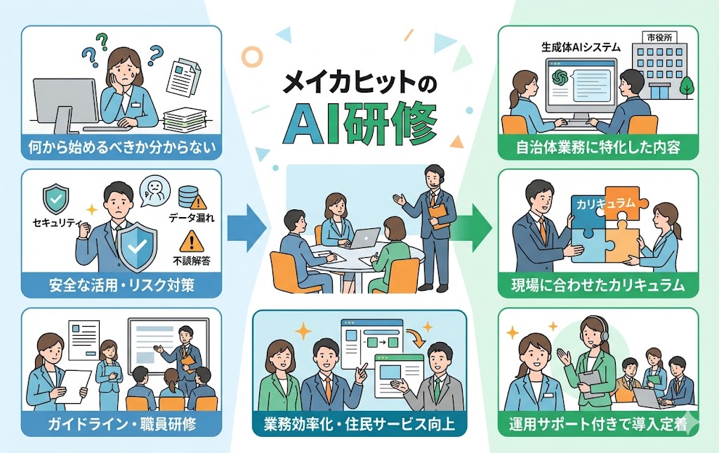 自治体での生成AI導入を安全かつ着実に進めたい方は、メイカヒットのAI研修をぜひご活用ください。