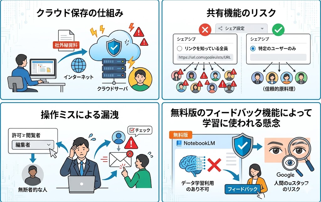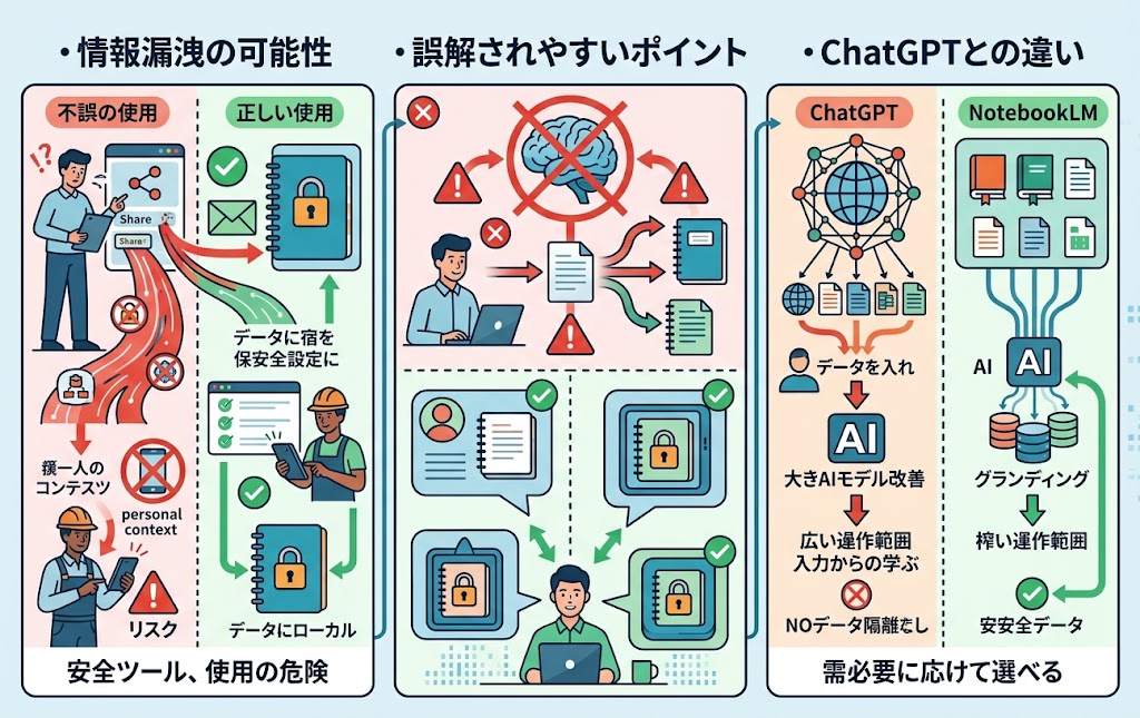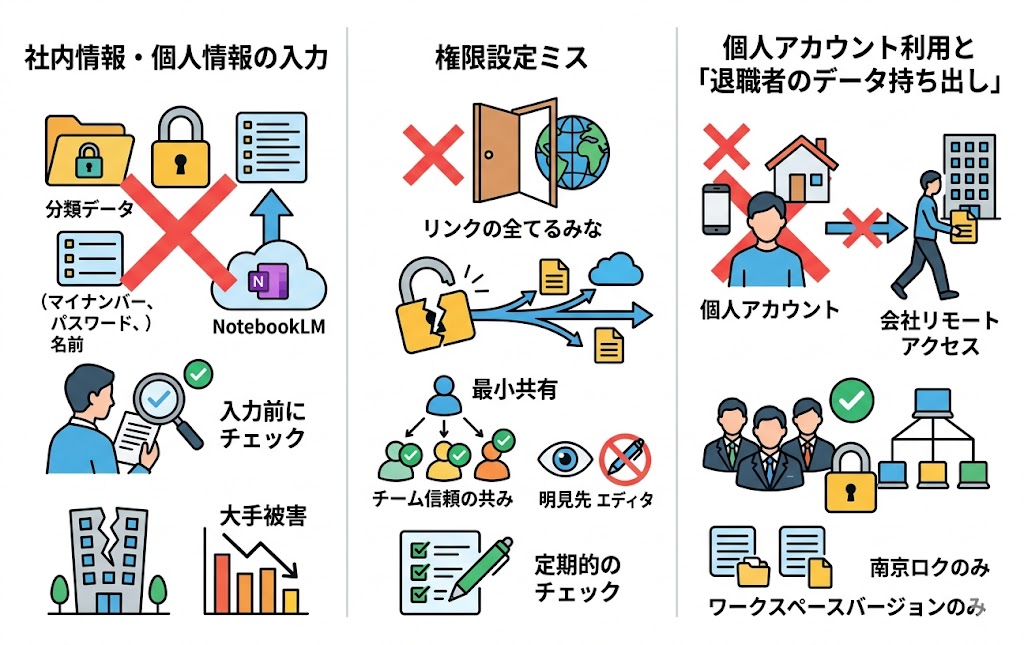 NotebookLMは安全に使えるツールですが、使い方次第でリスクが生じる点を理解しておきましょう。