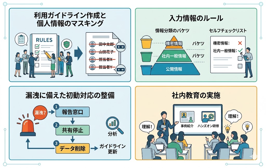 安全な運用には、「明確なガイドライン策定」と「アップロード前のマスキング」の2つの対策が効果的です。