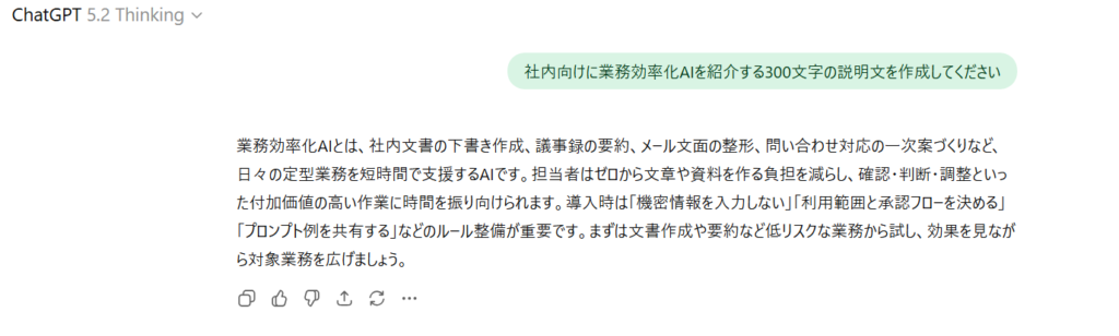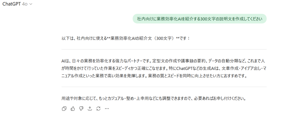 「社内向けに業務効率化AIを紹介する300文字の説明文を作成してください」という指示を与えてみました。